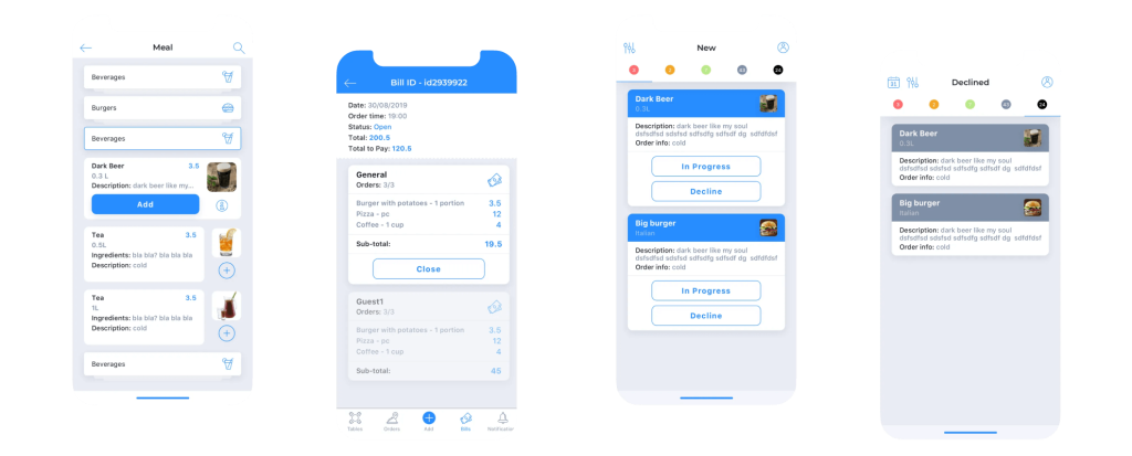 The app presents a customized Menu section, helping waiters add courses to orders and know all the ingredients for serving dishes. If a client wants to enhance a company’s branding, it is possible to request customization of the app.