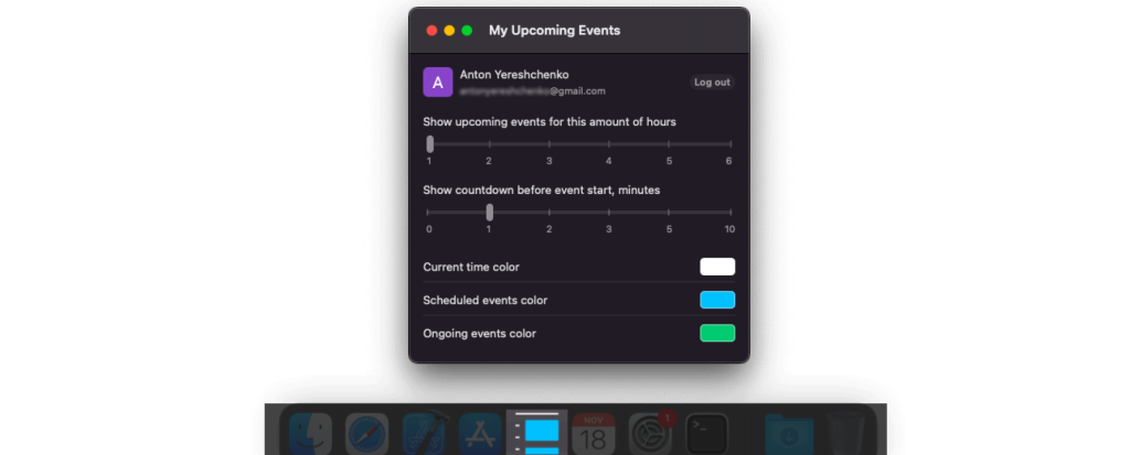 Developed to visualize today’s upcoming events from your Google Calendar in the Dock application icon and shows a countdown before the event starts.